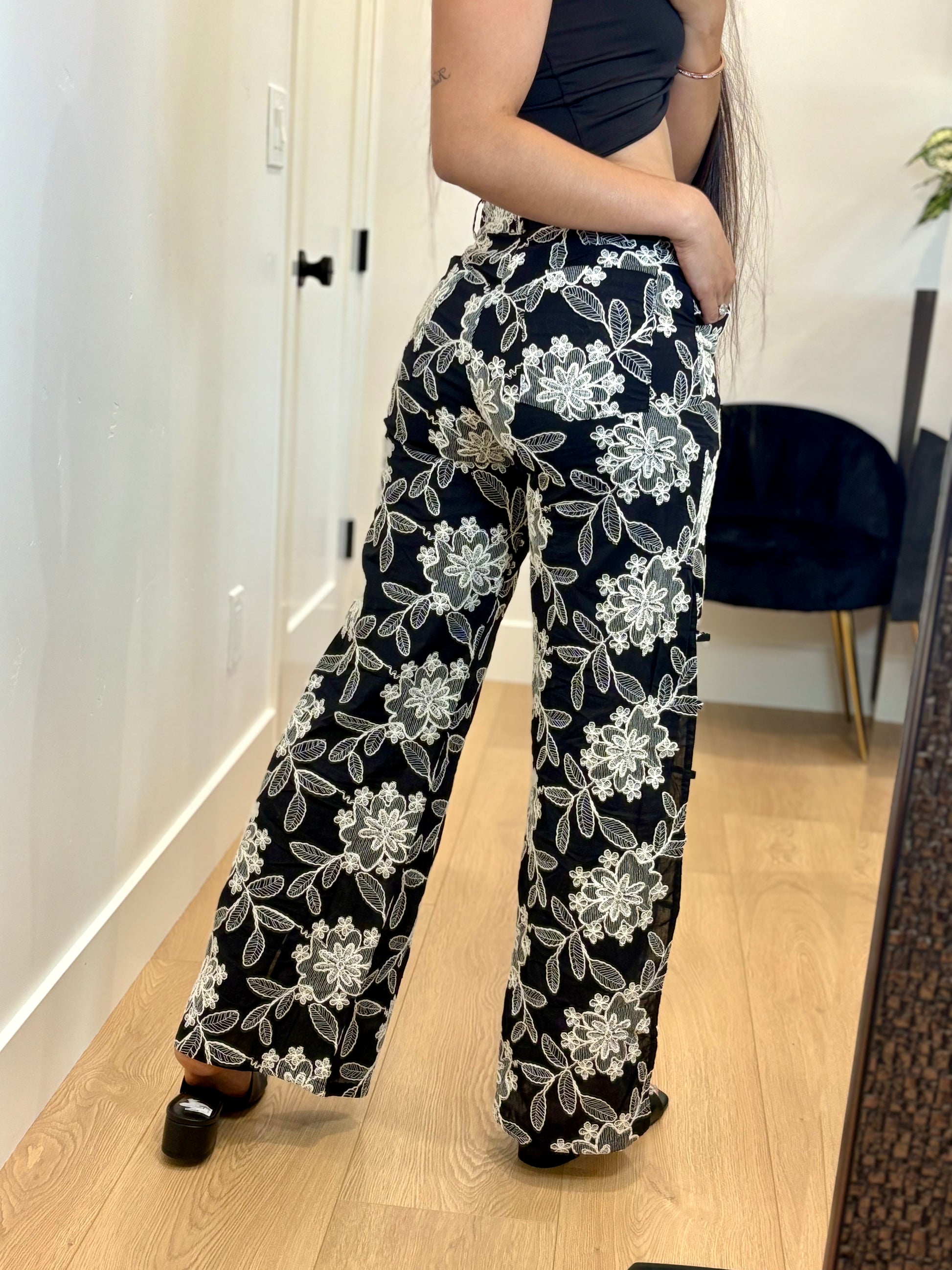 Elevate your look with these beautifully embroidered floral lace pants. Their wide-leg silhouette flatters the figure, while side cut-outs and semi-sheer fabric add a flirty, modern edge.