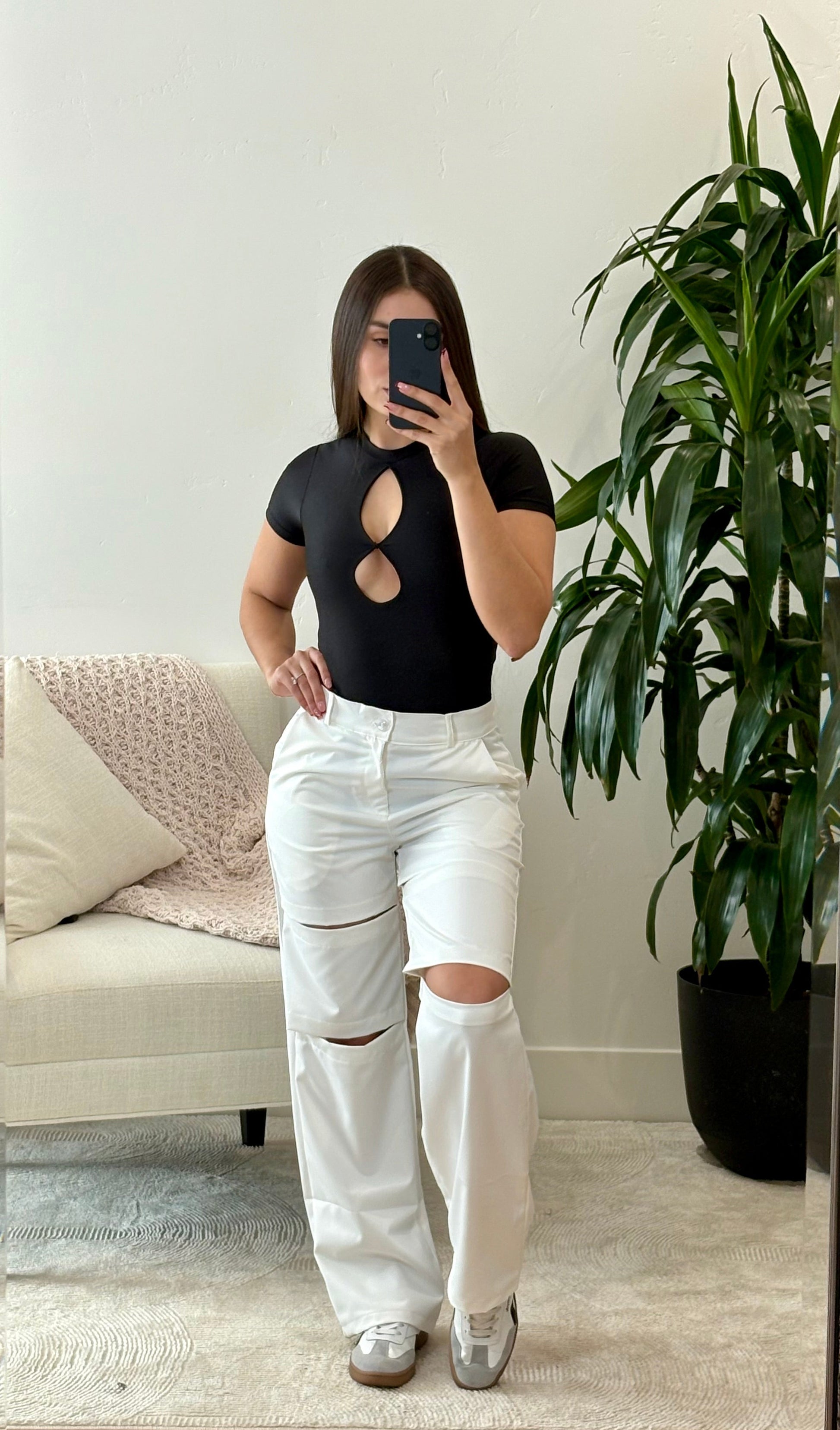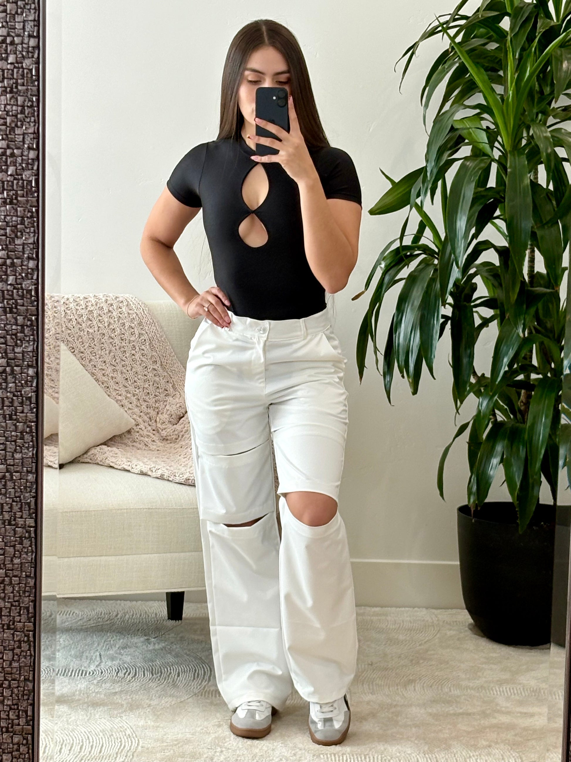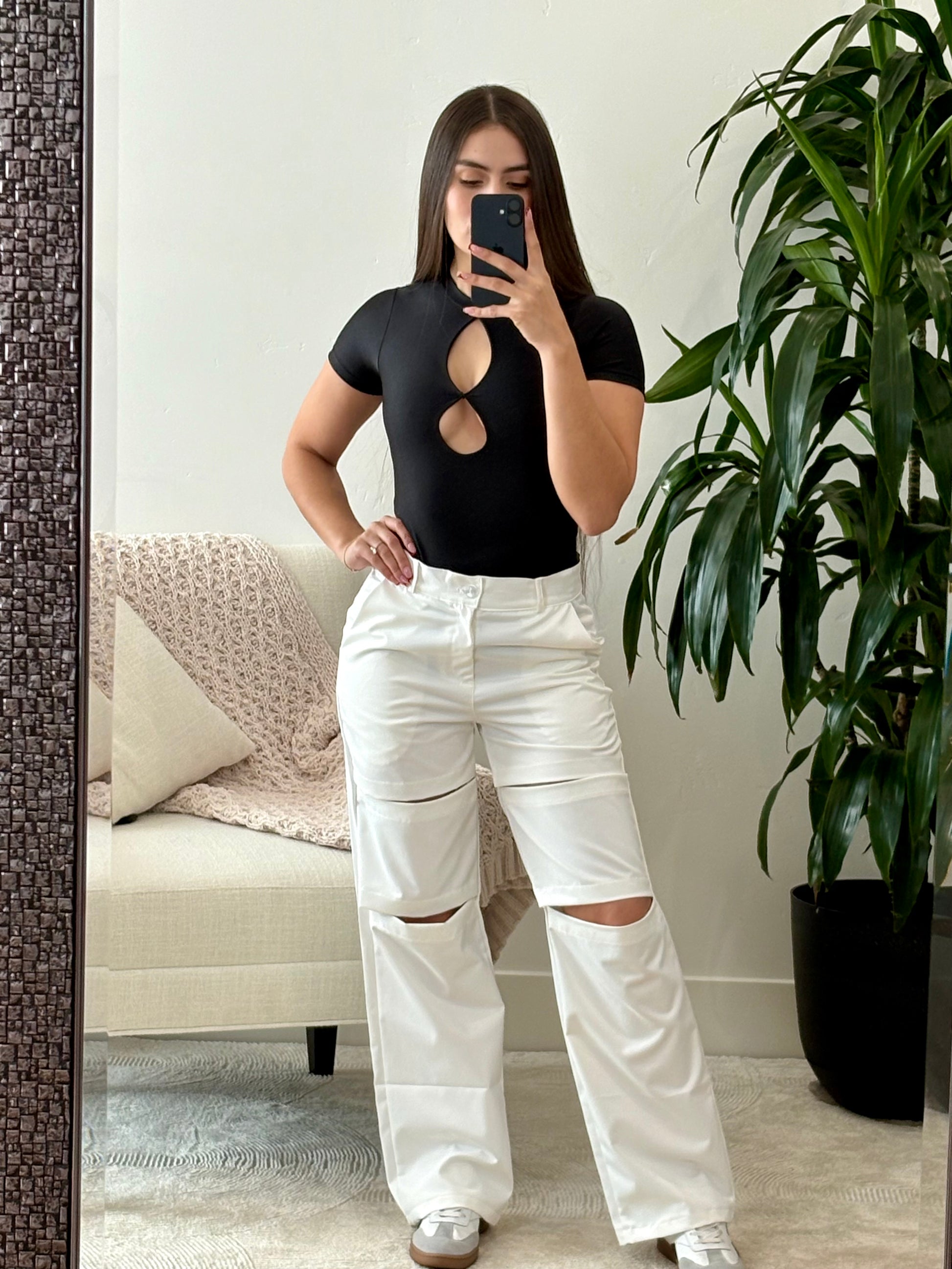 Pantalón blanco cargo con cortes (más edgy / urbano)