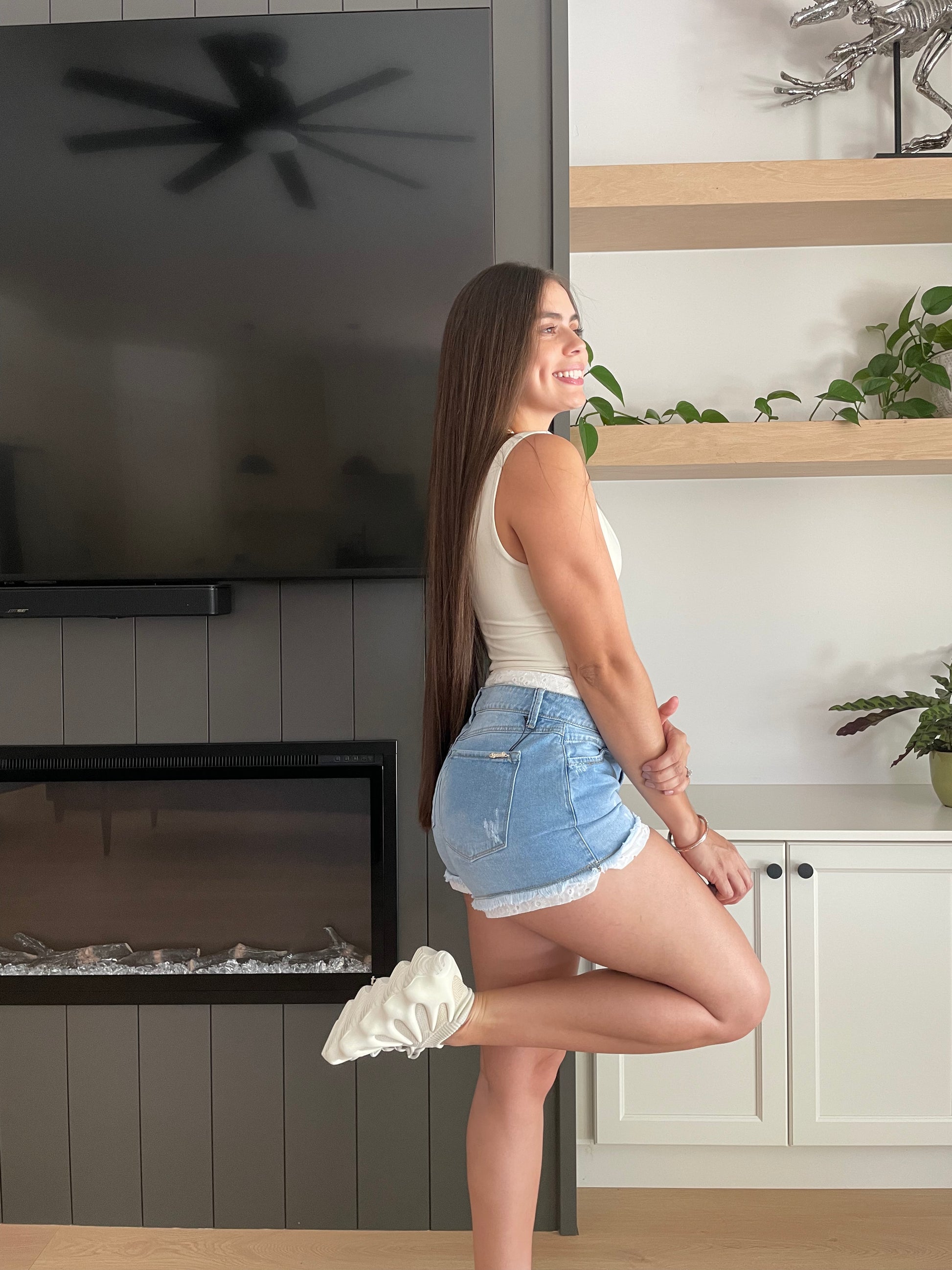 These light-wash denim shorts with delicate lace trim are the perfect mix of flirty and casual. Ideal for sunny days, laid-back outings, or just showing off your feminine edge with a touch of charm.