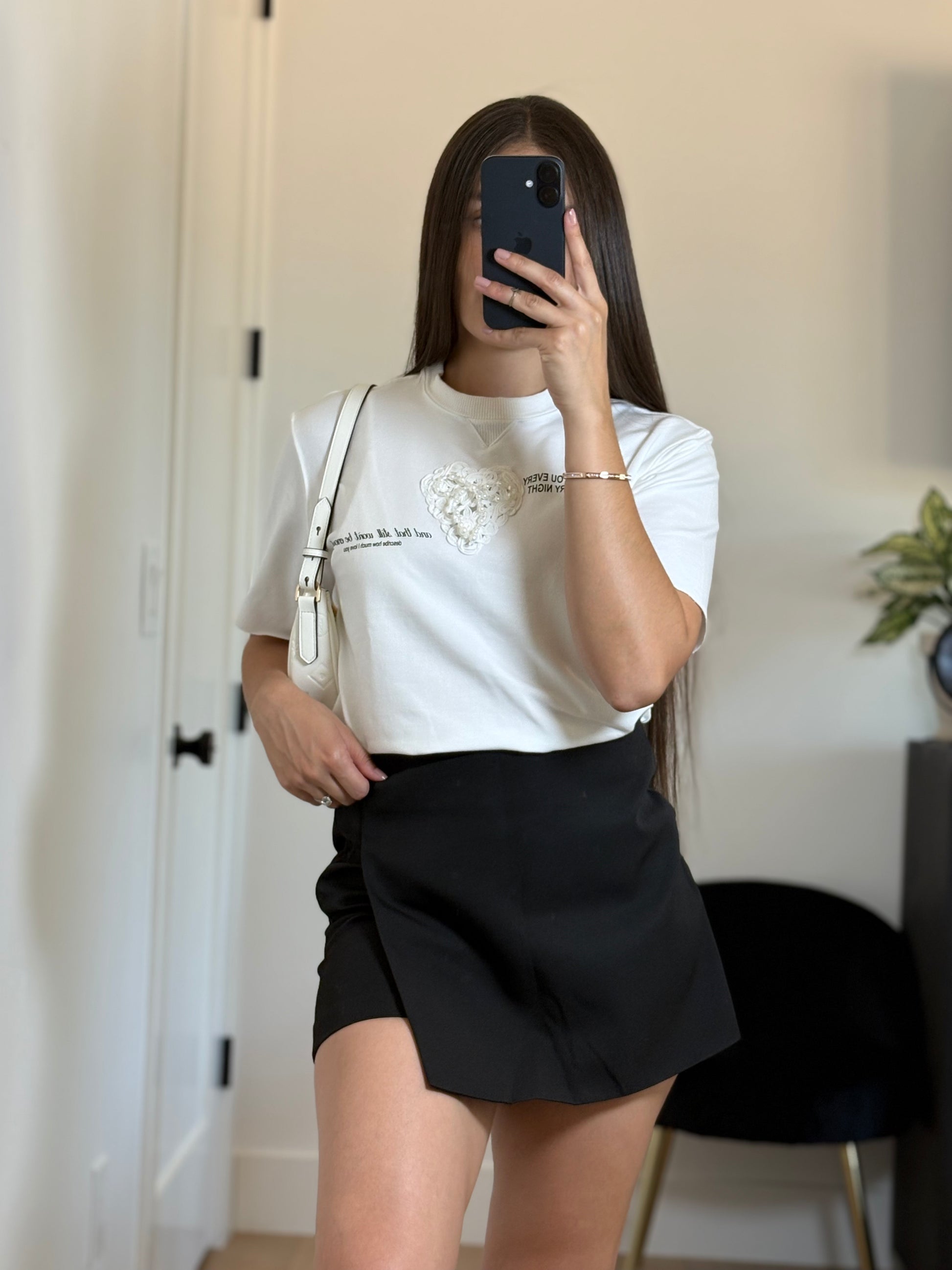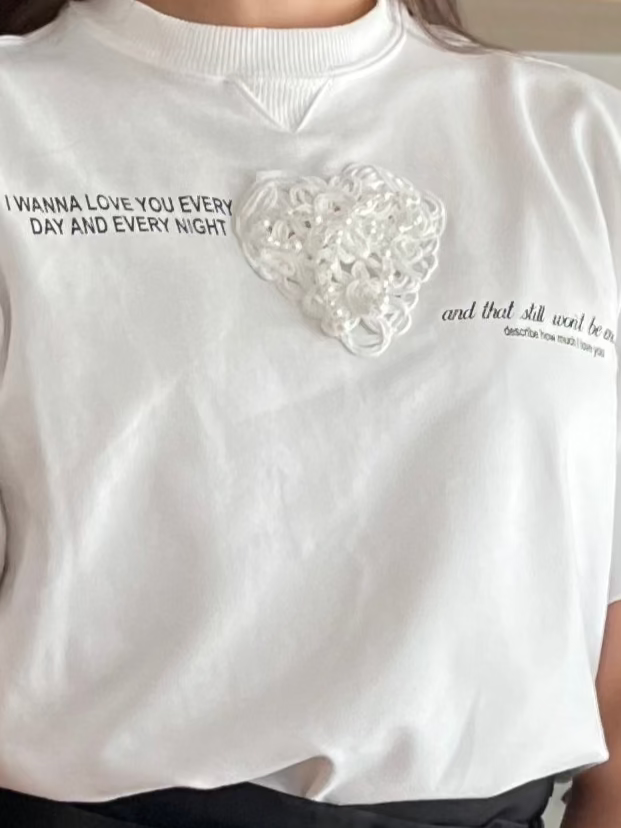 Esta camiseta blanca de corte clásico presenta un corazón en relieve y un delicado texto bordado, que le da un toque dulce y único. Perfecta para combinar con vaqueros, faldas o shorts y lograr un look informal y emotivo.