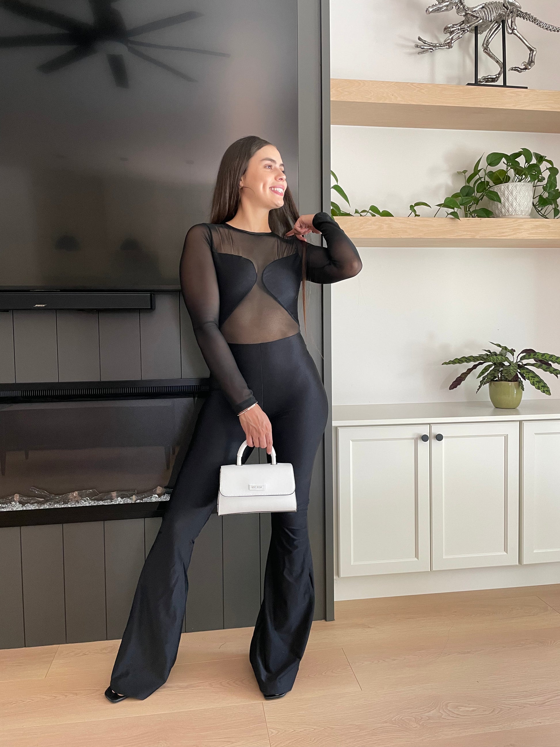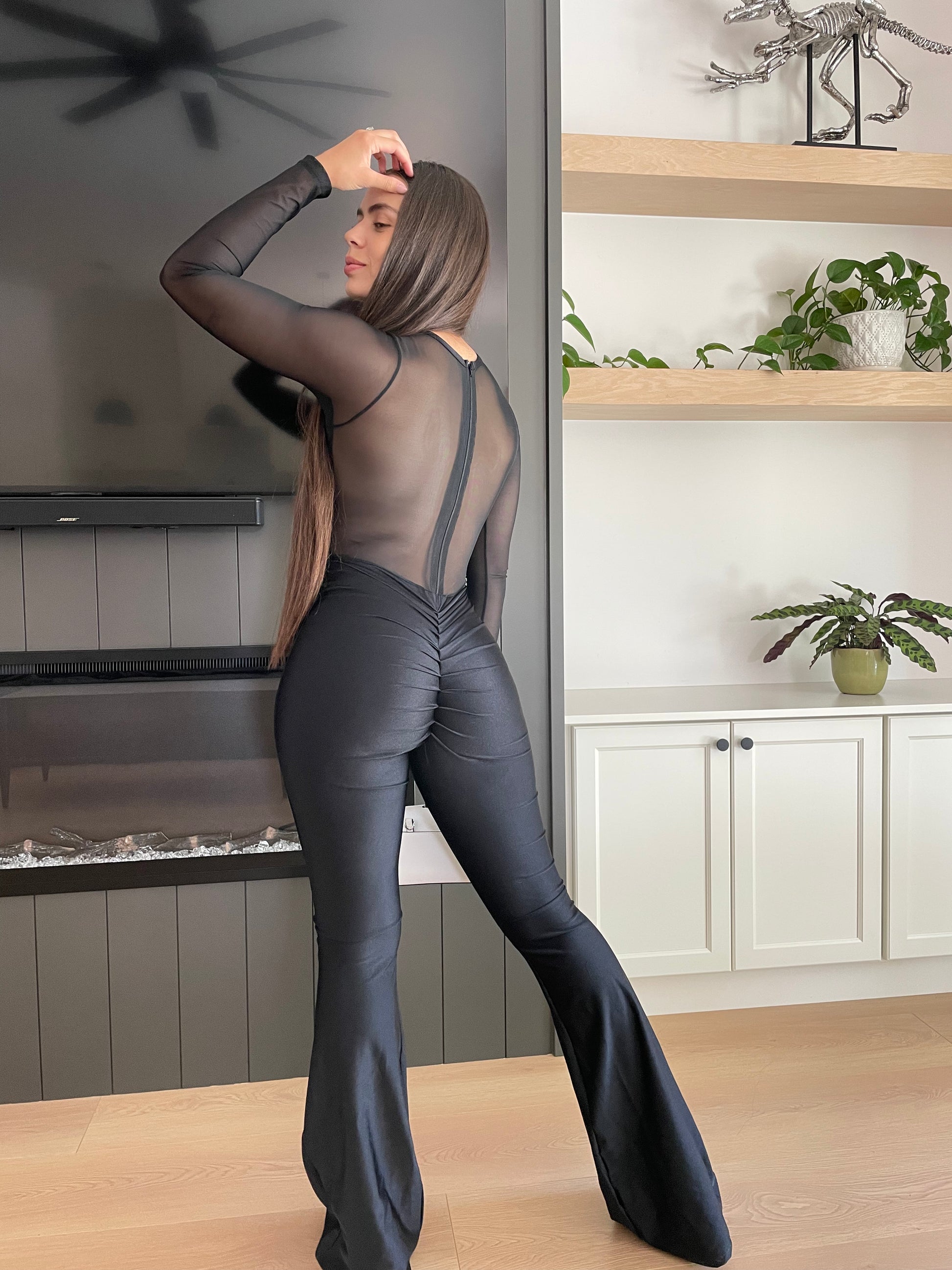Este mono negro de paneles transparentes y manga larga combina sensualidad y sofisticación. Su corte ceñido, su efecto lifting visual y la espalda fruncida realzan cada curva, perfecto para looks de noche atrevidos o eventos especiales.